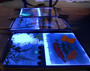 Tarptautinę vaikų knygos dieną plušėjome knygų iliustracijos dirbtuvėse!Ilgakiemyje popieriaus lapai buvo tepami raudonojo kraujo druskos ir geležies citrato mišiniu (cianotipija), tuomet kiekvienas pasitelkėme savo kūrybinį matymą, vėliau darbai eksponuoti po ultravioletine lempa bei pamerkti į vandenį. Ir štai vienetiniai kūriniai jau mūsų rankose.
